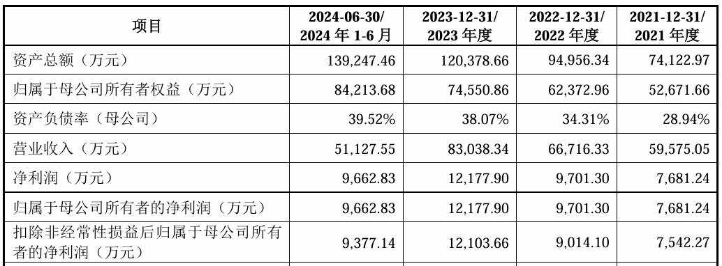 2021年、2022年、2023年度和2024年上半年(下同“报告期”),古麒绒材的收入分别为5.96亿元、6.67亿元、8.30亿元和5.11亿元,归母净利润分别为7681.24万元、9701.30万元、1.22亿元和9662.83万元,整体呈上升态势。