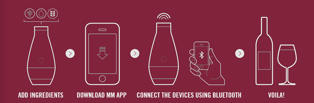 该款App应用程序的发明者名叫PhilipJames。他的这一灵感来自于一次与侍酒师好友KevinBoyer喝酒时的突发奇想。经过一年的测试,James和Boyer最终成功得出了这一硕果。他们采用水、酵母和葡萄浓缩汁来发酵酿酒,并通过这个App程序加以控制,在实验室中的效果明显,能酿造出典型的葡萄酒果香和风味。该程序既能安装在苹果的iOS系统上,也适合Android系统设备。我们只需把原材料加入机器,然后通过这个APP程序选择自己需要的葡萄酒风格,程序就将控制发酵,并在发酵完成之后发出指令。