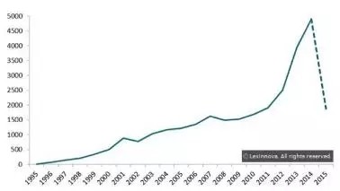 这张图表明,从1995年到2013年,可穿戴设备领域的专利申请一直呈现增长趋势。不过,2011年以前的曲线相对平缓,表明专利申请数增长缓慢。2012年到2013年间,增长曲线开始变得陡峭,增长加快,这也反映市场对可穿戴设备的需求在急速增长。2014年和2015年的增长数似乎在递减,这是由于这两年申请的许多专利目前还没有公布于众。