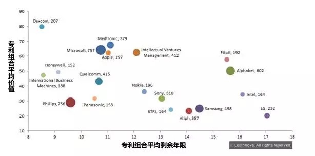 LexScore用专业的评分框架对可穿戴设备领域TOP20企业的专利组合价值进行了排名,得出以上散点图。横坐标是各企业专利组合的平均剩余年限,纵坐标为专利组合的平均价值,而圆形面积的大小代表了该企业专利申请数的多少。从图中可以看出,微软、飞利浦和Alphabet申请数最多。Dexcom(一家医疗设备公司)、Medtronic和微软专利组合价值最高,而谷歌、英特尔和LG专利组合平均剩余年限最长。苹果、诺基亚、三星、索尼等公司三项指标都处于中游水平,尤其是三星,专利数量并不少,平均剩余年限也很长,但是平均专利价值明显偏低。综合比较三项指标,量大质优、年限也不短的微软似乎更胜一筹。