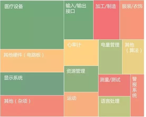 这幅热度图反映了可穿戴设备的各个细分领域的专利申请和许可情况。从每一块的面积来看,面积越大,代表这一领域的专利申请越多,同时也意味着这一领域越重要;而从颜色上看,红色系代表这一领域未来的专利许可活动预计会有很多,颜色越深越热门。相反,绿色系代表可能发生的专利许可活动相对较少。黄色则处于中等水平。