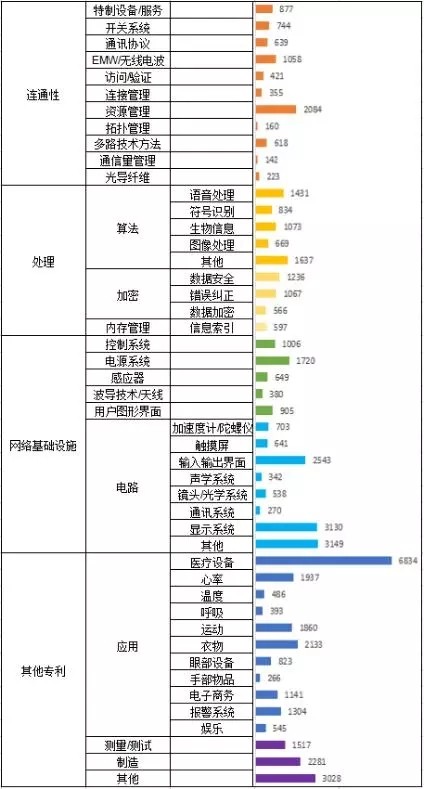 可穿戴设备主要分为4大技术领域:连通性、处理、网络基础设施、其他专利。而这4大技术领域又可细分为多个不同领域。从该表可看出,专利申请排名靠前的技术领域分别为:医疗设备(6834)、电路(其他)(3149)、显示系统(3130)、输入输出界面(2543)、制造(2281件)、衣物(2133)、资源管理(2084)、心率(1937)、运动(1860)、电源系统(1720)。其中医疗设备(6834)遥遥领先,可见在可穿戴设备中,医疗领域占据了重要的分量。另外,衣物(2138)、心率(1937)、运动(1860)、专利申请数量也相当可观,可以预想,未来我们的日常生理数据监测将越来越智能。不过,娱乐(545)、温度(486)、呼吸(393)等领域的专利申请不是很高,还有待加强。