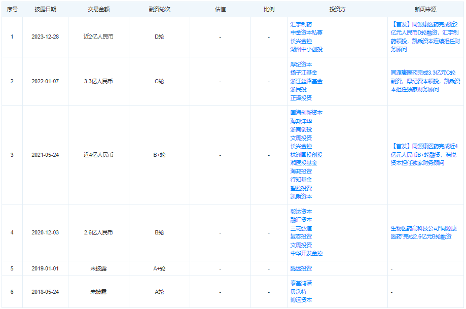 而近年来公司的发展,很大程度依托融资驱动。据天眼查,同源康医药已经完成6轮融资,最近一轮融资发生在去年12月,实现D轮近2亿元交易金额,由汇宇制药领投,中金资本旗下基金、长兴金控和湖州人才基金等知名机构跟投。
