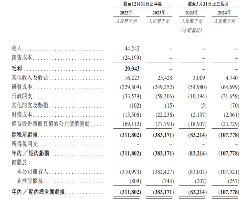 据招股书,近年来公司营收为0,其中2022年所获得的4424.2万元,还是来自2020年与丽珠医药达成的管线对外授权协议的里程碑付款。另外,亏损情况颇为显著,截至2024年一季度,公司累计亏损约11.17亿元。