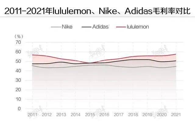 以lululemon为例,其瑜伽裤单价过千元,几乎是耐克的两倍左右;过去十年,lululemon毛利率始终高于耐克、阿迪达斯;2021年财年,lululemon毛利率为57.7%,分别比耐克和阿迪达斯高出12.9个百分点、7个百分点。