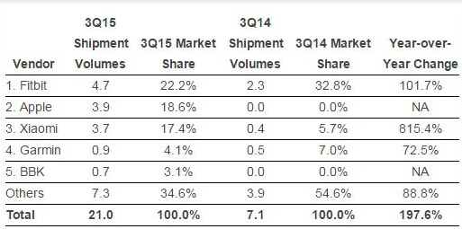按照排名,Fitbit第三季度出货量为470万只,雄踞第一,比去年同期翻了一番,去年同期为230万只,由于Apple Watch等品牌纷纷在今年上市,让它的市场份额从去年同期的32.8%下滑至22.2%;