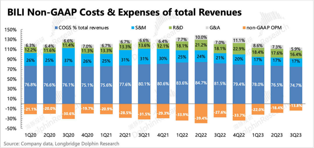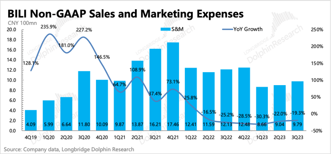 三季度B站经营亏损11亿,亏损率19%,环比优化了5个点。因为收入的承压,使得今年的季节性优化节奏相较去年Q3有明显放缓。
