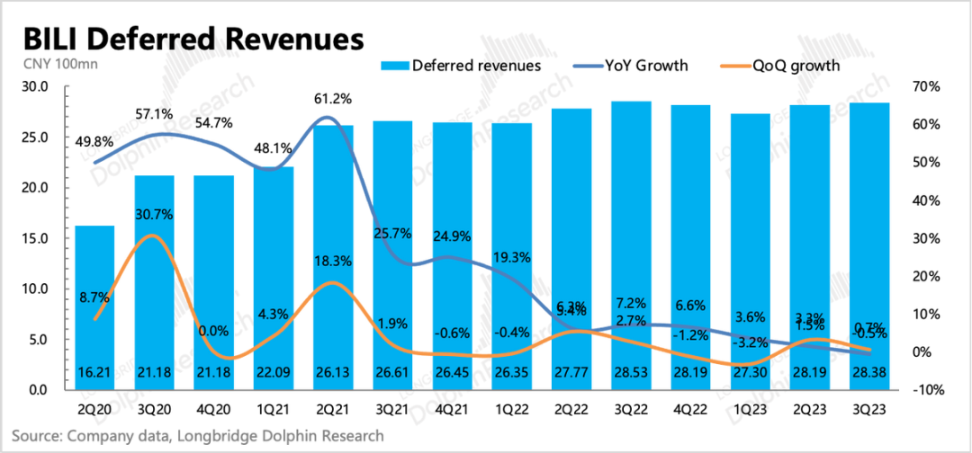 三季度游戏超预期下滑33%,实际上除了《优俊少女》的事故,7月以来还新上了好几款游戏,比如《斯路德》、《摇光录:乱世公主》、《千年之旅》等等,但一个能打的都没有。矮子中选将军,其中表现最好的《千年之旅》,放到B站所有还在运营的游戏里面,还不及《碧蓝航线》。从流水趋势上看,三四季度可能还得靠《FGO》等一些n年前代理的游戏吃老本,但递延收入暴露现实,压力仍然山大。