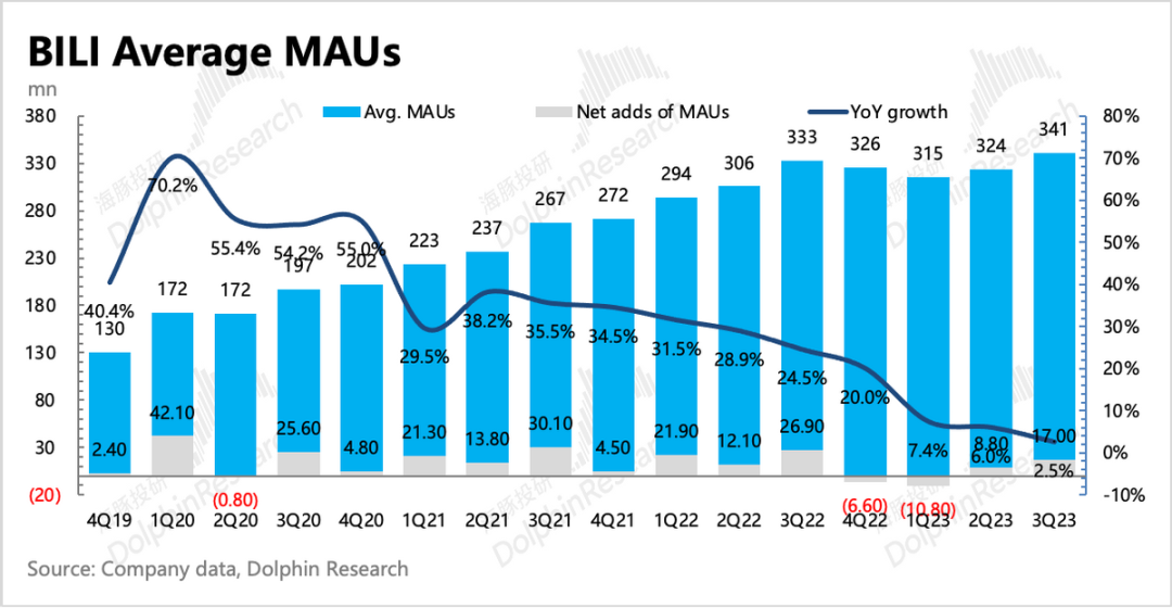 1、三季度B站整体月活(App、PC、电视等)亿人,同比增长2.5%,环比净增1700万人。