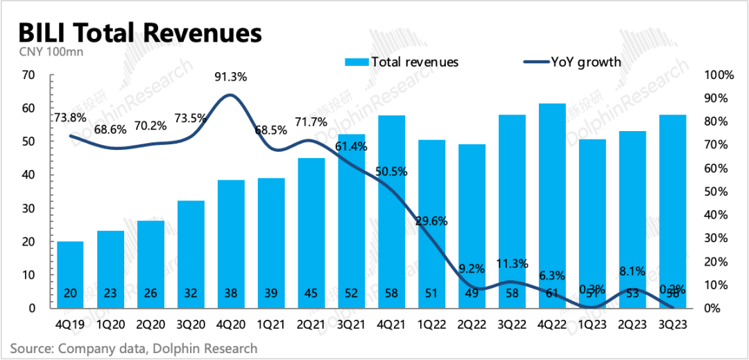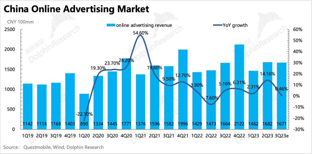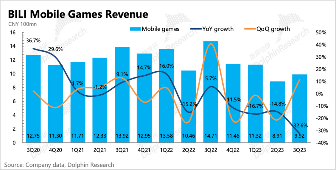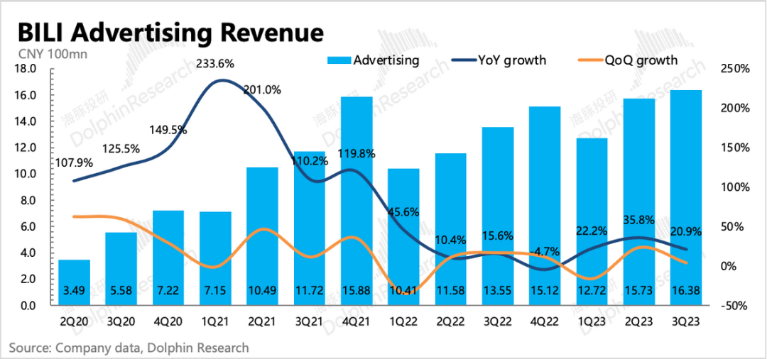 为了填补游戏业务的收入缺口,B站这两年商业化的节奏明显加快,再加上电商竞争下,跨平台的买量需求暴增,因此B站也吃到了一些红利。直接主要体现在,虽然三季度宏观带来的行业承压(零增长),B站虽然不做电商,没有内循环广告,但也有20%以上的增速。