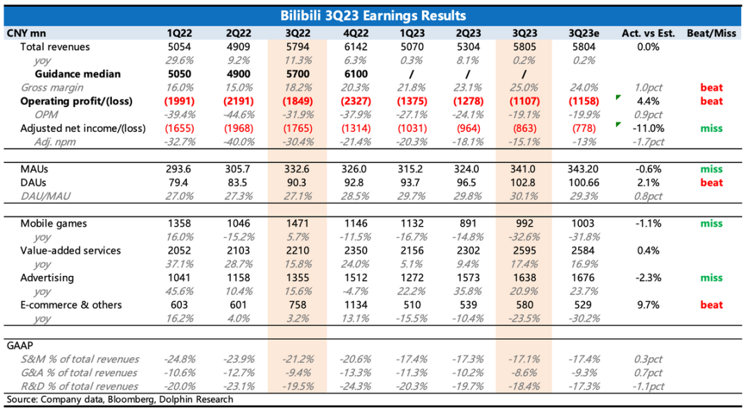 2、游戏歇菜,拖累增长:收入上继续因为游戏的问题,增长被抹平。当然,在《闪耀!优俊少女》持续不见恢复上架的情况下,市场也已经逐渐下调预期。三季度广告、直播业务维持较高的增长,游戏同比下滑33%,因为绝对值不高,所以不考虑小幅波动的话,当期的收入基本上符合一致预期。