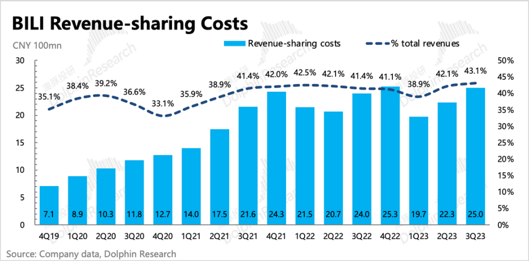 收入分享成本同比增加了4%,在游戏同比33%下滑下,收入成本的增量应该就是主要来自于花火广告分给Up主、直播流水分给主播和工会了。
