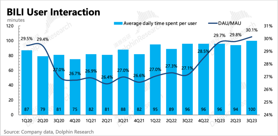 2、存量用户的粘性提升,DAU/MAU首次突破30 %。日均用户时长100分钟,继续新高。