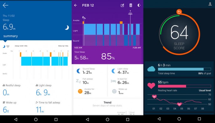 同晚睡眠数据从左往右:Microsoft Band 2、Jawbone Up2、Beddit