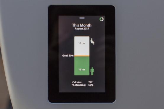 事实上,电动升降桌并非Stir Kinetic首创,但它却是第一个将触摸屏融入办公桌的品牌。这块5英寸的电容屏幕分辨率不高(800*400像素),但却非常实用,可以方便地完成各种设备,包括建立账户、连接WIFI等等。当用户输入完身高、体重、性别等信息之后,便可以设定站立目标,这便是Stir Kinetic Desk M1所提供的不同体验:站立提醒。