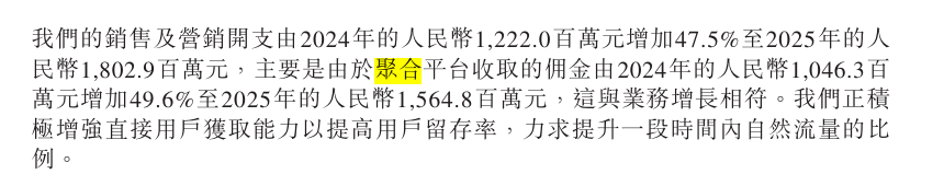 据招股书,2022年至2024年,来自聚合平台的订单交易额占公司GTV比从49.9%攀至73.2%,再到85.4%;同期订单量占比由51.4%升至74.1%,再至85.7%,依赖程度不言自明。