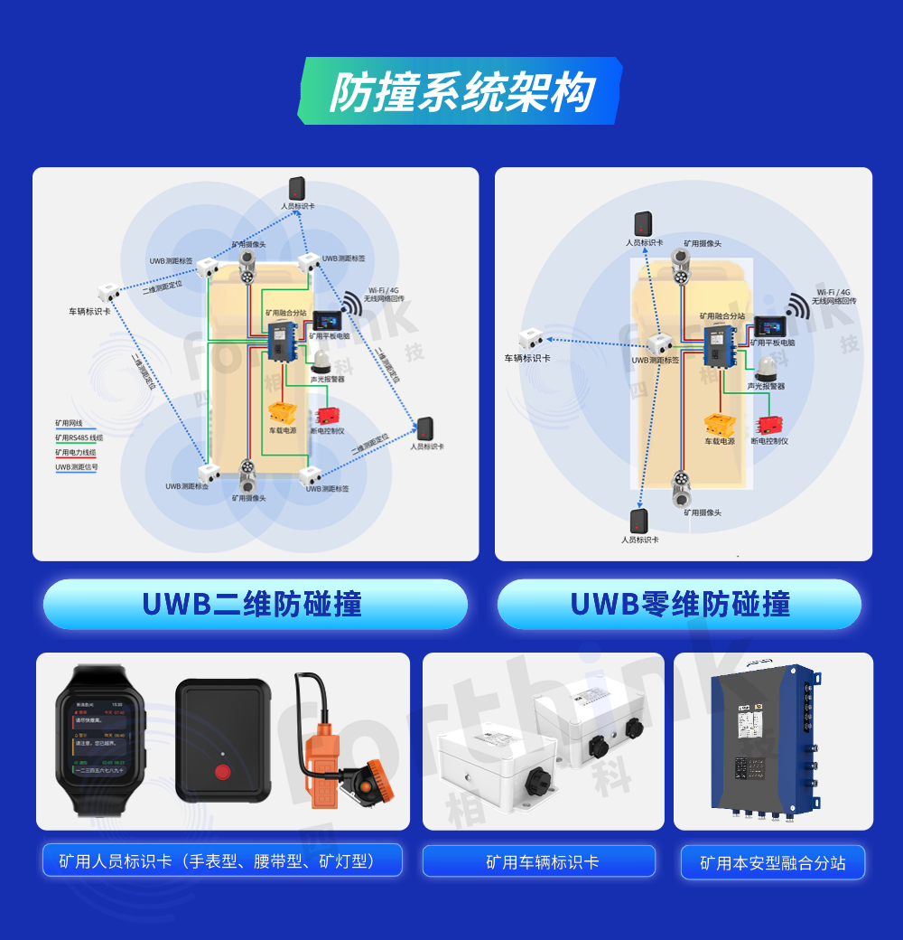 根据政策要求,四相科技基于UWB高精度定位系统,融合红外感应、机器视觉识别等技术手段,搭配人员/车辆标识卡、融合定位分站、矿用摄像头、声光报警器等硬件产品,打造矿用电子围栏人员接近保护系统解决方案。