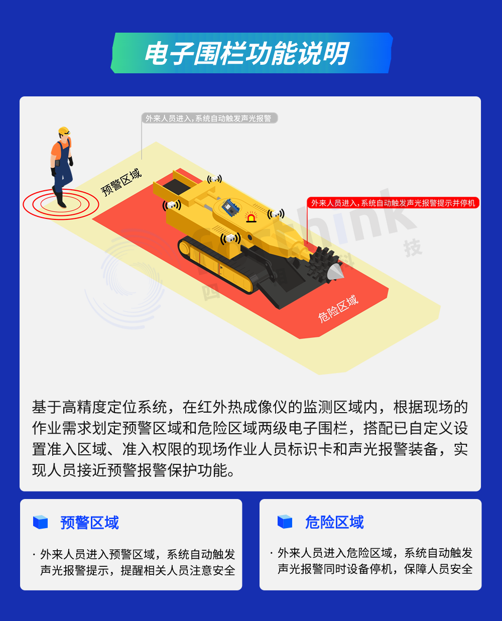 现场人员进入掘进工作面掘进装备的预警区域范围时,系统自动触发声光报警提示;进入危险区域范围时,系统发出声光报警提示同时触发掘进装备停机;