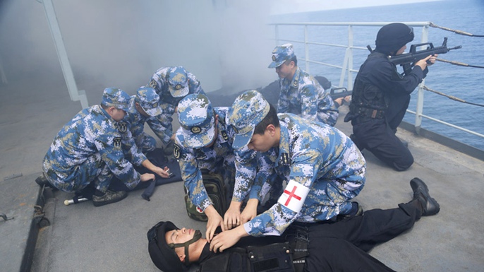央“为患者包扎,消毒,接通远程视频系统,准备实施会诊!”10月12日,中国海军第21批护航编队青海湖舰在执行护航过程中,组织开展了一场模拟战场环境下的医疗救护演练。随舰医疗队成功与广州军区总医院连线,将“患者”的心电监护信息通过网络实时传送到医院胸痛中心,为“患者”实施实时会诊。这是我海军护航编队首次依托国内首个“协同远程急救医疗物联网”开展远海救护,大大提高了海军远洋护航官兵的医疗保障效率。。