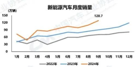 9月份,我国新能源汽车产销分别完成130.8万辆和128.7万辆,同比增长48.8%和42.3%。