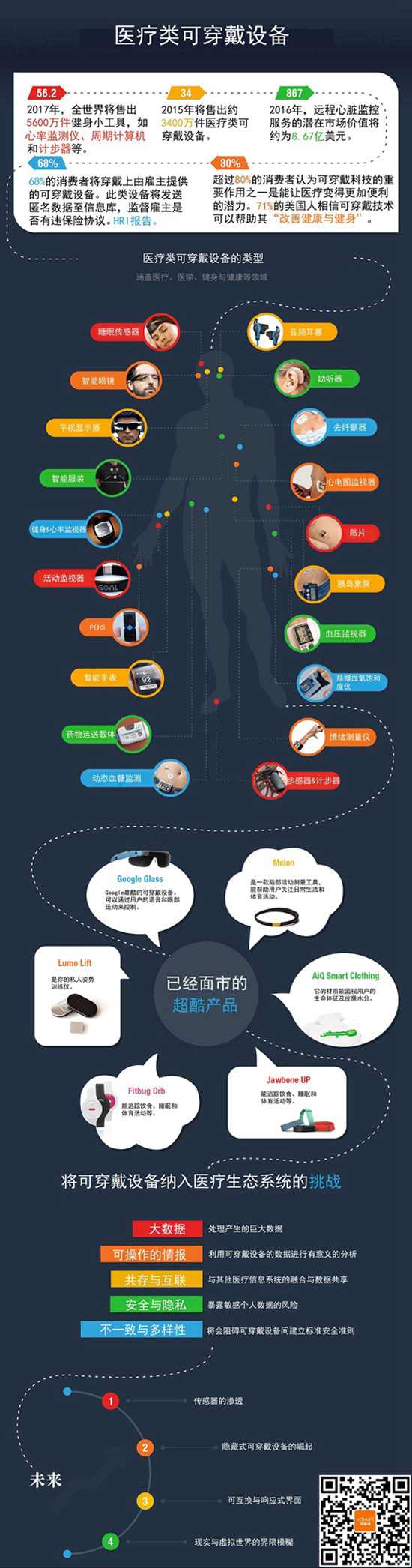 关于可穿戴设备在医疗健康领域的应用全景,波士顿科技公司(btc,Boston Technology)制作了一张信息图,对现状、趋势、分类,以及目前具有代表性的产品做了精炼的解释。同时,还分析了可穿戴设备融入医疗生态系统存在的几大挑战。