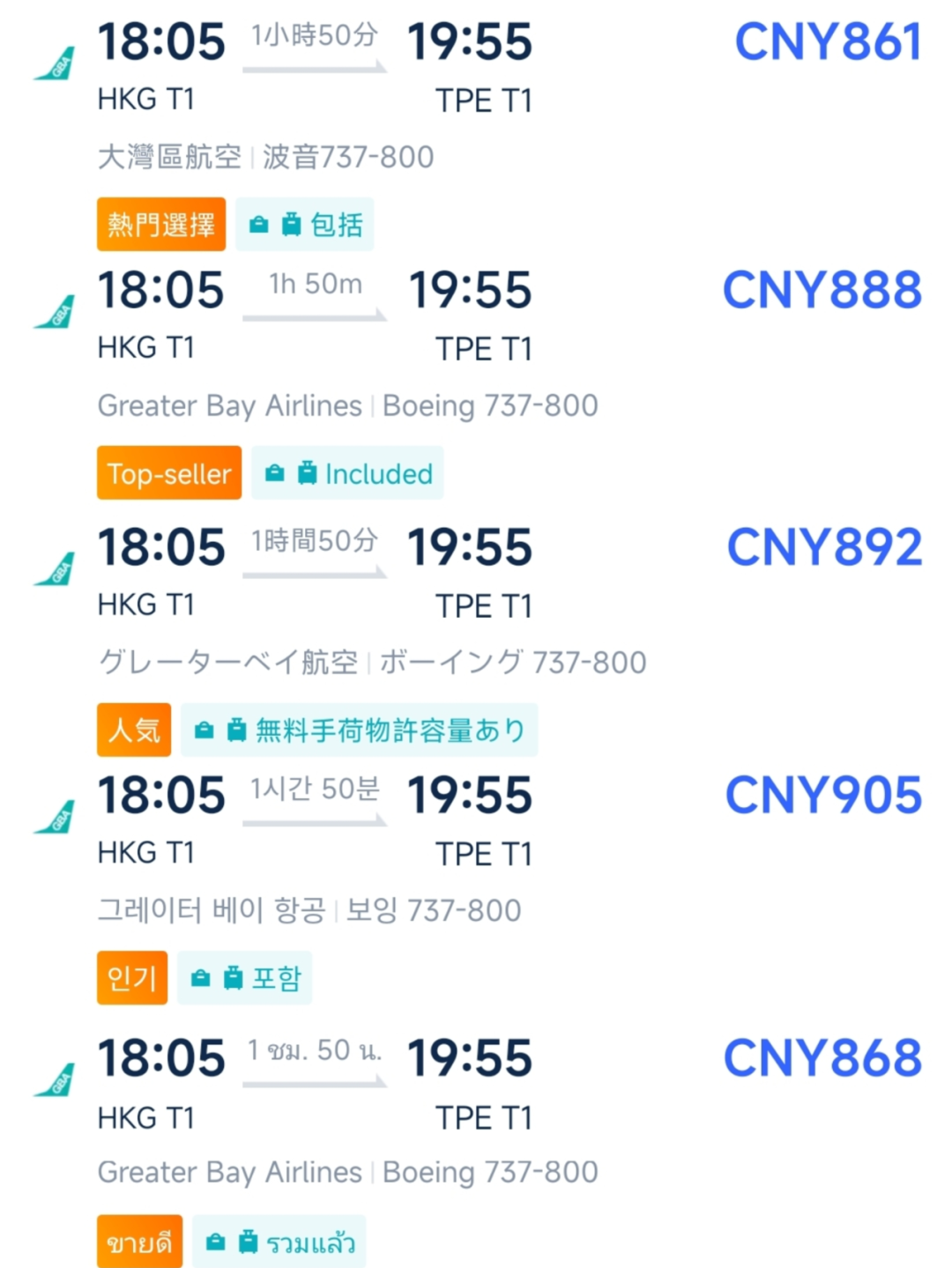 比如,潘哥在同一时间,查看香港飞往台北的同一航班,发现繁体中文售价861元、英语888元、日语892元、韩语905元、泰语868元。可以看出,因为香港和台北两地,官方语言都是繁体中文,因此繁体中文显示的机票价格也最便宜。