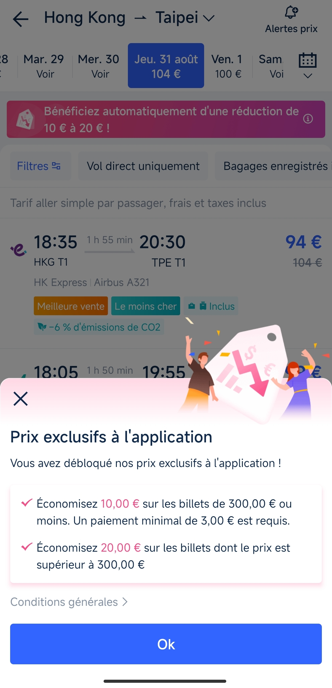 同时,进入机票购买界面后,还会显示具体的优惠政策。比如,在法语机票购买界面,显示300欧元以下的机票,可以优惠10欧元;超过300欧元的机票,可以优惠20欧元。