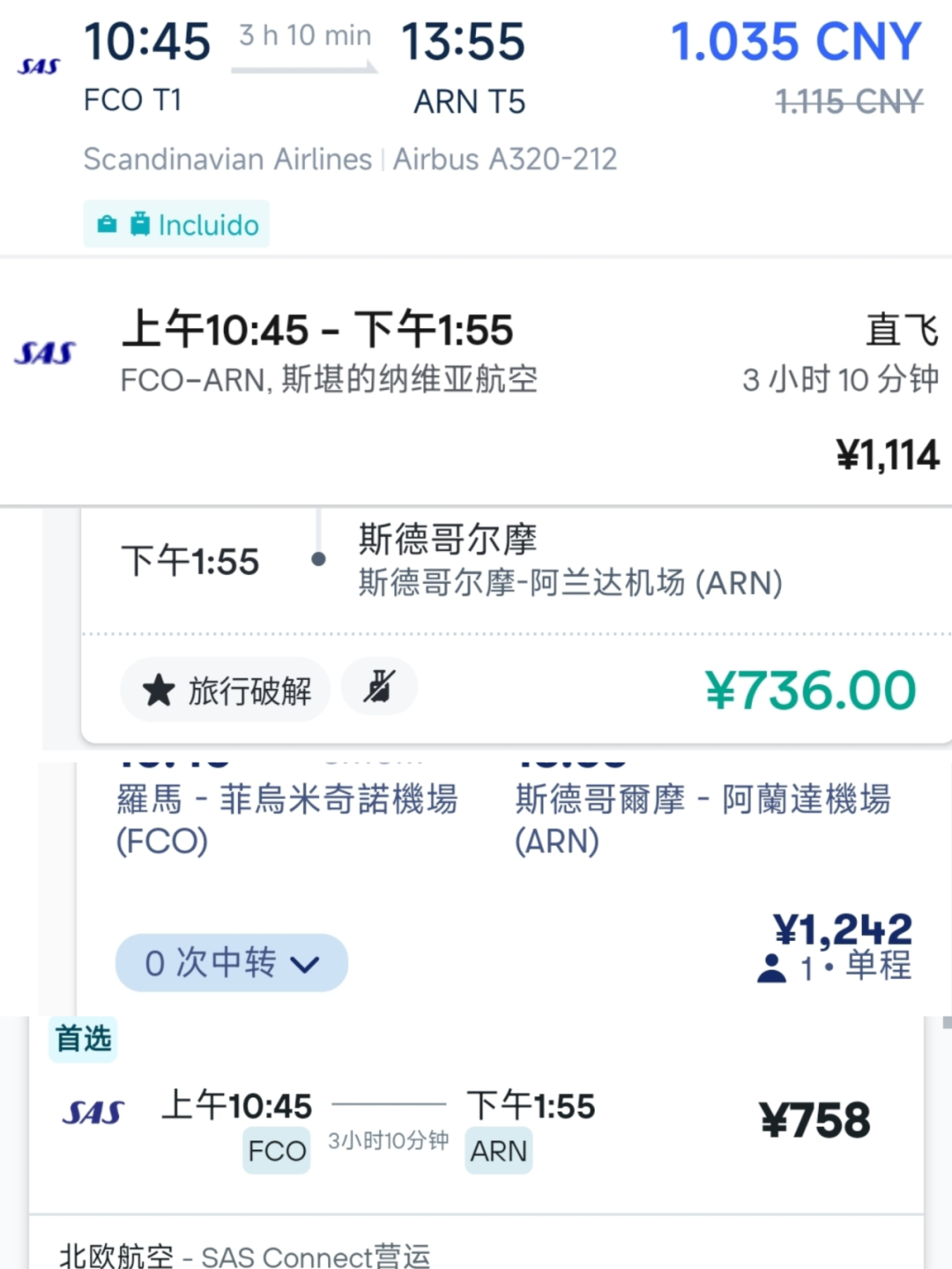 比如,潘哥选取同一日期,由罗马飞往斯德哥尔摩的航班,发现Trip上最低机票价格,为西语的1035元,对比其他OTA应用,Skyscanner上价格为1114元、Kiwi售价736元、Omio售价1242元、KAYAK售价758元,其中Kiwi和KAYAK上的票价,都比Trip最低价格便宜。