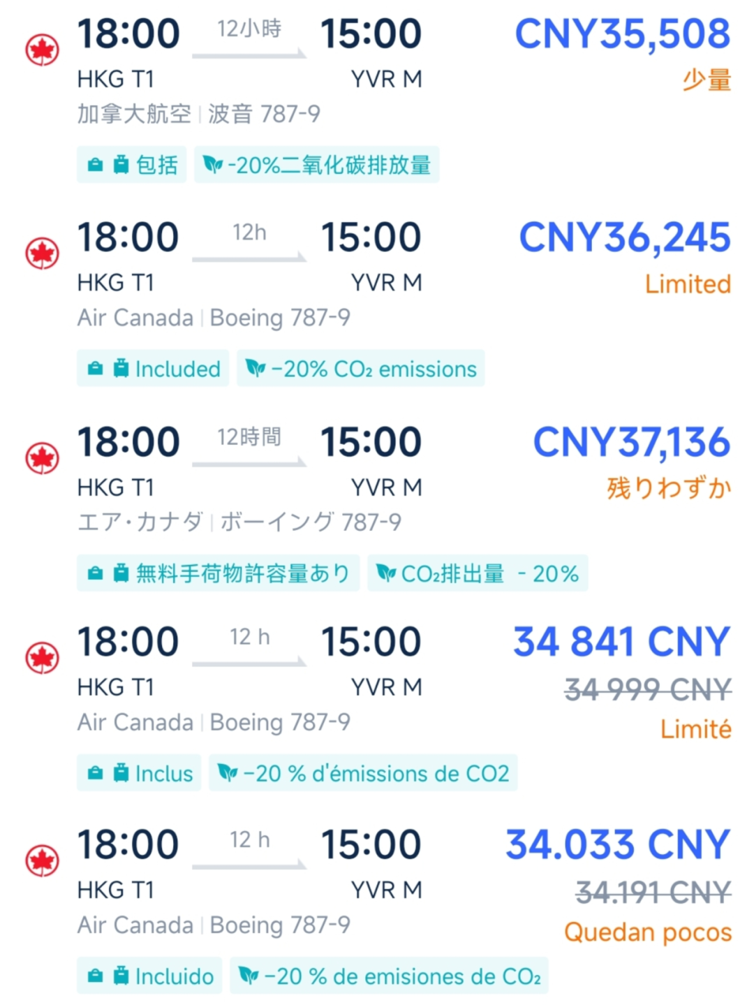比如,潘哥在同一时间内,查看在同一日期,由香港飞往温哥华的机票,发现相同的航班,切换五种不同语言后,机票售价也各不相同。