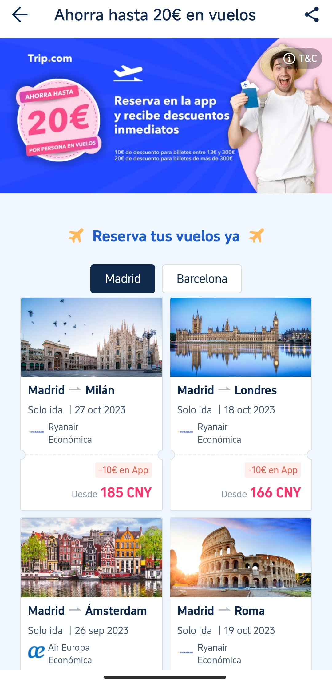 比如,潘哥切换西语后发现,特价机票都从马德里、巴塞罗那,这两座西班牙城市出发,其中马德里飞往伦敦的机票,最低价格仅166元人民币。
