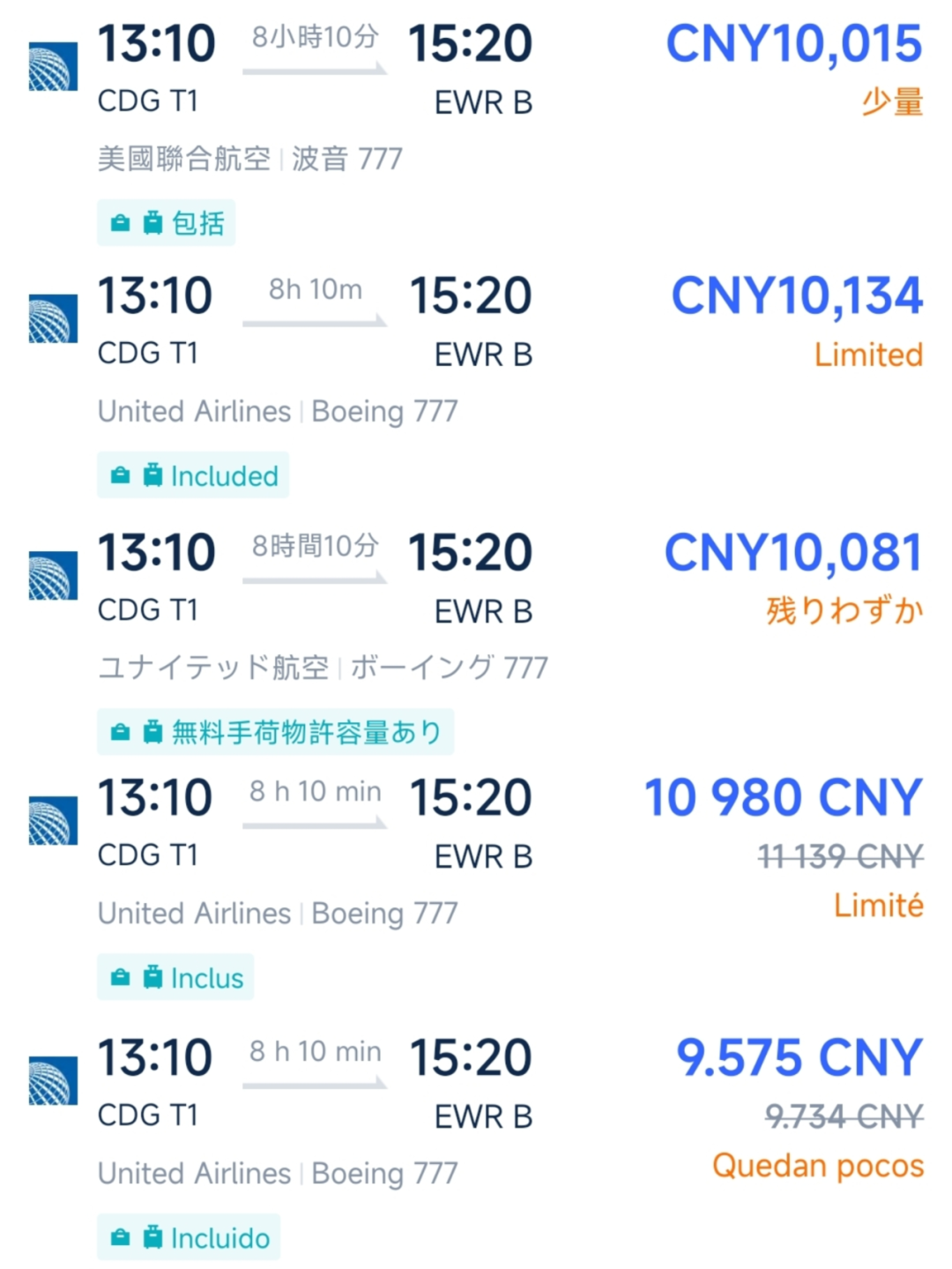 另一边,潘哥查看同一日期同一航班,由巴黎飞往纽约的机票,依旧选用上述五种语言,发现繁体中文售价10015元、英语10134元、日语10081元、法语10980元、西语9575元,西语再次位列最低价,而法语机票售价最高,两者相差1405元。