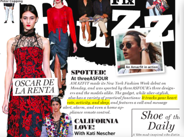 NewYork times、WWD、ELLE、VOGUE这些大牌媒体的版面在四大时装周期间花钱都买不到,而这样一个科技产品竟然如此轻松地获得了美国时尚圈如此大规模的报道与关注。不得不说Amazfit与ThreeAsFour的联合发布已经成为了科技时尚跨界合作的成功案例。