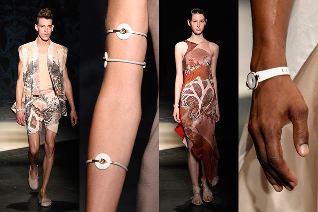 在今年的纽约时装周上,模特佩戴一款以平安扣为基础造型的手环走秀的照片像飓风一样席卷了各大时尚媒体的重要版面。单从外观上看,这款更像手镯的智能手环确实跌破了时尚编辑们的眼镜,大多数去看秀的专业人士都以为模特手臂上佩戴的是ThreeAsFour品牌推出的最新配饰。