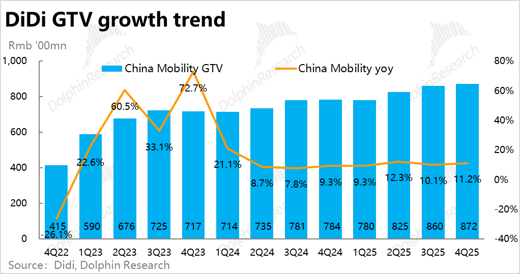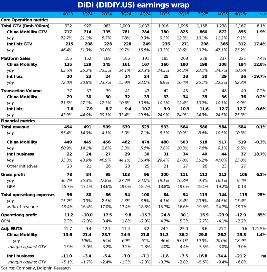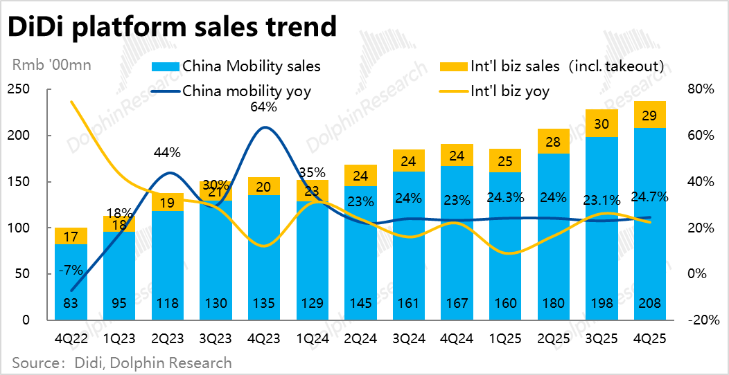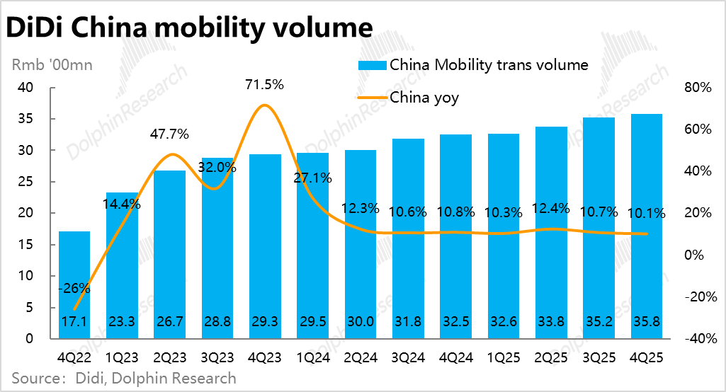 首先,国内出行业务大概率仍会维持当前的稳健增长状态,预期营收在26年仍同比增长高个位数%,利润(adj.EBITA)则增长15%~20%,即约150亿左右。