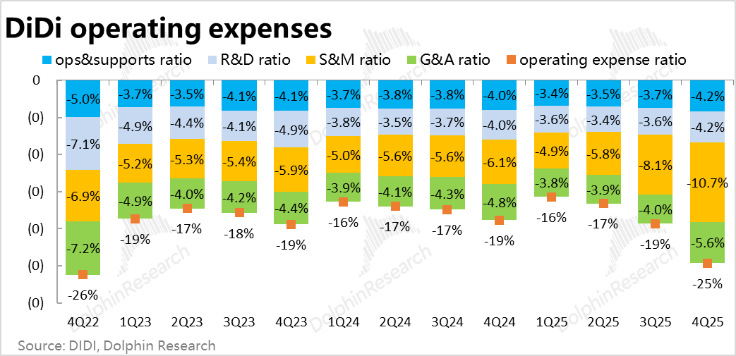 不过,海外订单量则是同比增长了25%,增速只是较上季略有提速。订单量和GTV增速差距明显、看似奇怪。实际是因为外卖业务单量规模仍很小(据测算25年占总海外GTV仅3%),但客单价数倍于网约车(可能3~5x),因此对GTV的拉动明显强于订单量。