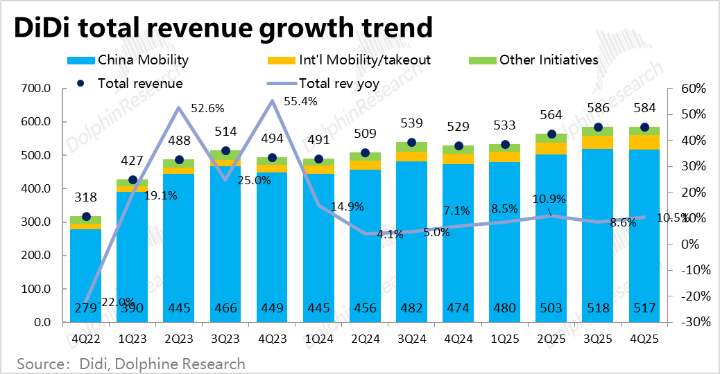 汇总国内、海外加上其他创新业务,滴滴本季总营收约584亿,同比增长10.5%,在海外业务带动下有所提速,和市场预期基本一致。