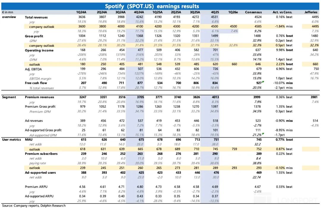 Spotify 2025 年四季报在 2 月 10 日美股盘前出炉,整体业绩稍好于预期,财报前因为多种负面叙事,情绪跌到冰点,股价一路调整,因此一份 “不出错” 的财报就足以释放一些担忧了。