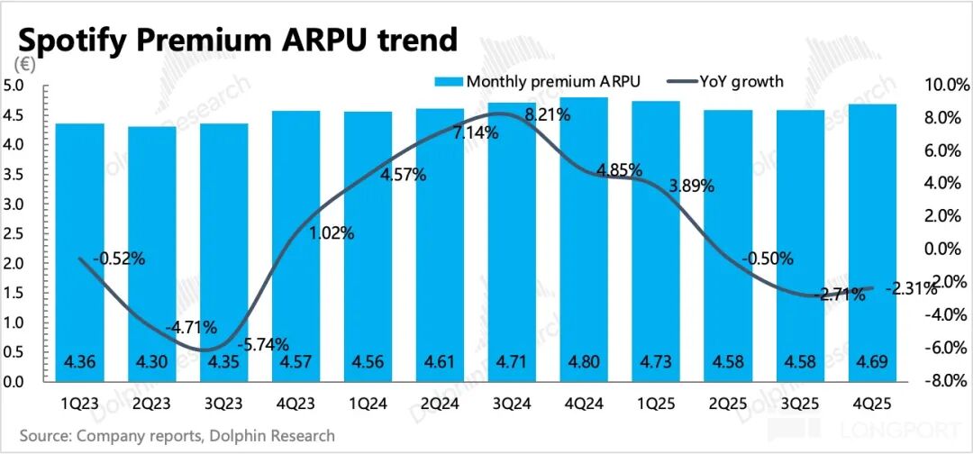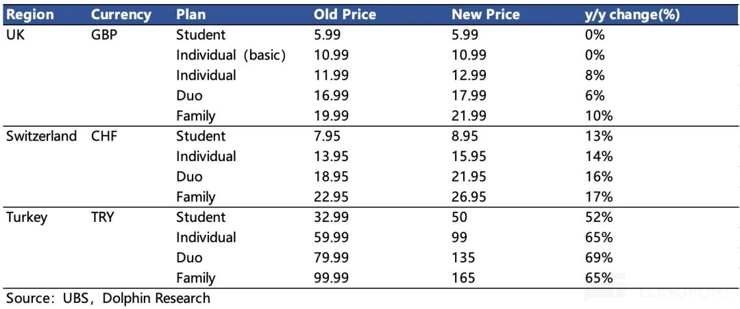 四季度公司对英国、瑞士、土耳其进行了涨价,而今年一月中旬又如期宣布了对美国地区涨价(仿照澳大利亚地区,保持基本套餐价格不变,提高捆绑套餐价格,这样有利于减少涨价部分给到头部 Labels 的分成),这些高购买力地区的涨价被视为核心驱动力。
