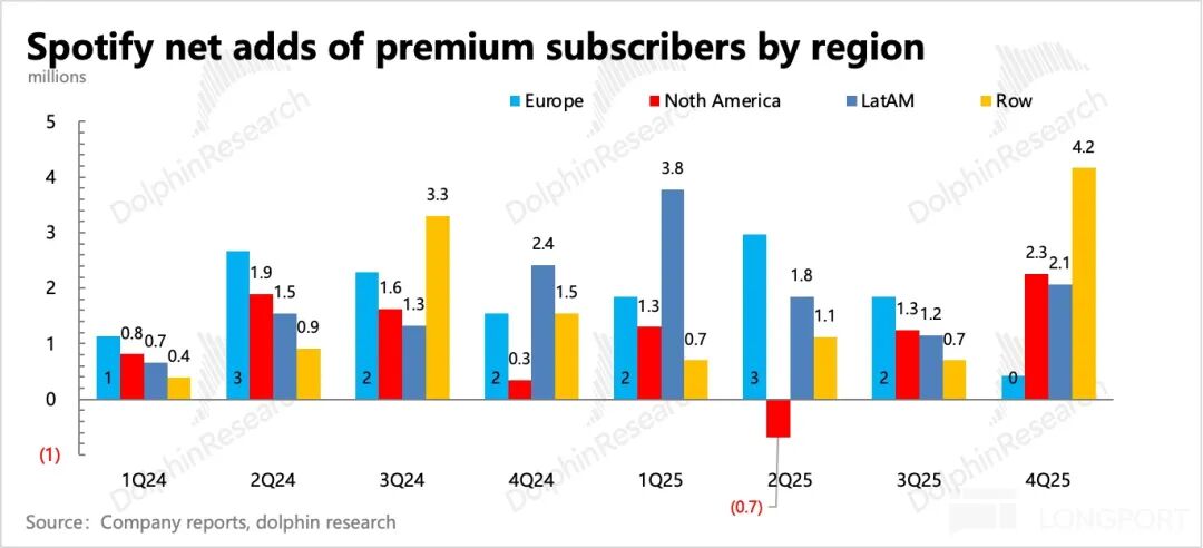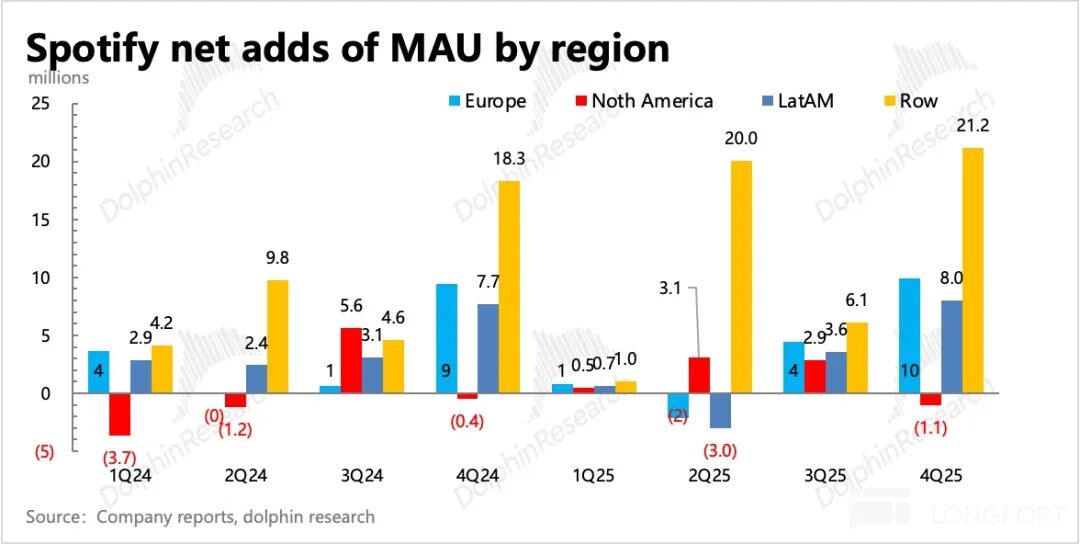 2. 用户生态稳定:Q4 平台月活突破 7.5 亿,环比净增 3800 万,甚至优于前一年爆炸的用户增幅。分地区来看,主要来自于其他地区(亚洲为主),其次则是欧洲、拉美地区,由此体现 Spotify 上半年对产品功能优化的正面拉动效果。