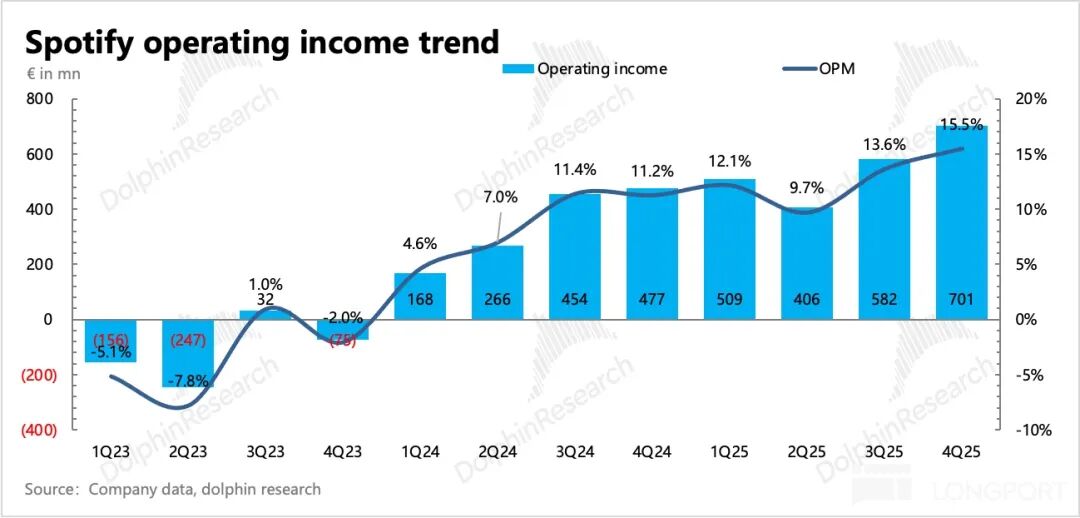 由于版权成本率很高,毛利率变动对最终盈利能力会非常敏感。因此毛利率也一直是市场对 Spotify 最关注的财务指标,一方面体现的是横向竞争力(对终端用户提价话语权),另一方面体现的是纵向产业链地位(对上游的议价权)。因此 Q4 毛利率的表现应该是对悲观情绪得到一些缓解最关键的因素。