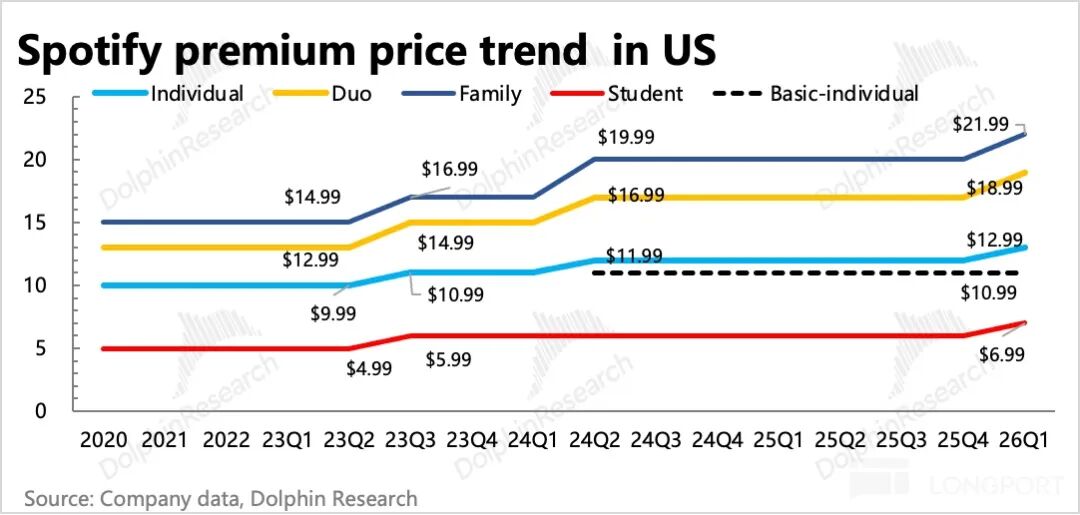 2025 年 Spotify 主要对欧、亚、拉美洲等地区进行涨价,但用户价值最大的几个核心地区,尤其是北美地区,并没有涨价。直到 1 月底 Spotify 才宣布对美国地区不包含 Basic 的各套餐进行 1-2 美元的提价,综合下来平均涨幅大约为 10%。