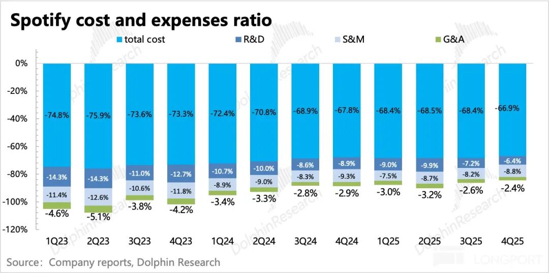 因此这恰恰体现了传统平台经济,规模化效应对盈利能力的拉动效果。对于 Spotify 来说,可能尤为明显,对比更大头但无法规模化的版权成本,经营费用上的支出显得更加收缩自如。