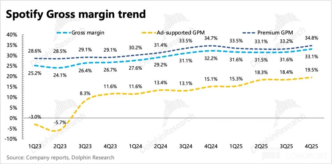 这个幅度似乎比积极多头的预期要低,一方面,多头比照过去 15%-20% 的涨幅,另一方面因为版税成本增加综合看也有个 5-10%,因此光提价 10% 对 Spotify 毛利率的拉升并不明显。