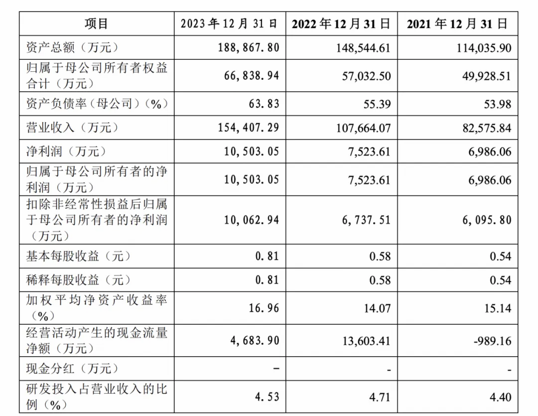 业绩规模随之扩大:2021-2023年,公司营业收入分别为8.26亿元、10.77亿元、15.44亿元,净利润分别为6986.06万元、7523.61万元、1.05亿元。与此同时,公司也已经推进创业板IPO,当前处于审核问询阶段。
