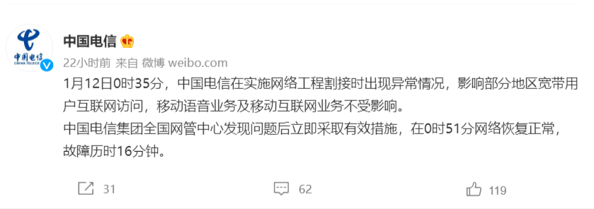 1月12日,大量用户反映中国电信断网,波及全国多个城市,由于影响范围较大,“电信断网”的话题还登上了热搜。