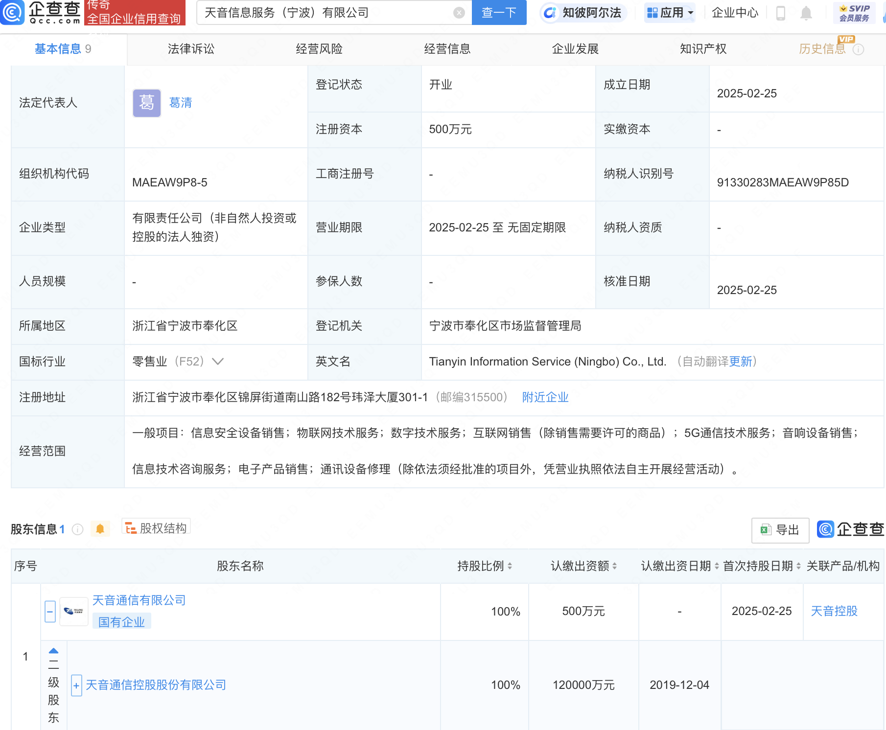 企查查APP显示,近日,天音信息服务(宁波)有限公司成立,法定代表人为葛清,注册资本500万元,经营范围包含:信息安全设备销售;物联网技术服务;数字技术服务;5G通信技术服务等。企查查股权穿透显示,该公司由天音控股(000829)间接全资持股。