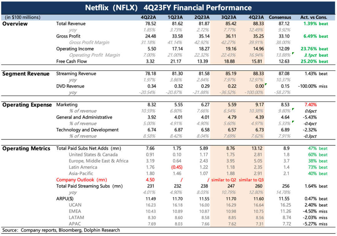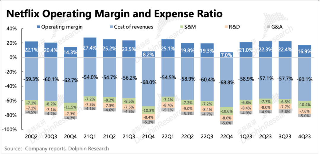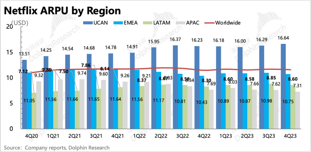 2024年一季度仍然没有给明确的用户指引,但管理层预估会有季节性回落(低于23Q4),但肯定会高于去年同期水平(1Q23 +175万)。目前市场预期在430万左右,海豚君认为,从四季度的内容热度延续,以及打击账户共享和广告套餐的推广力度来看,整体超预期不难。