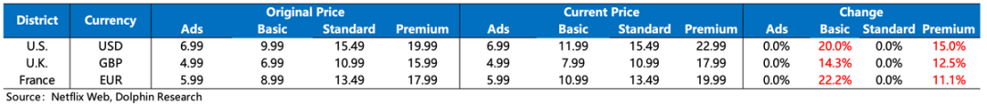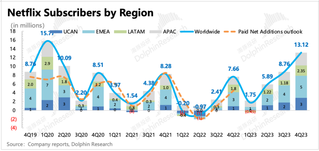 海豚君认为,虽然一季度一般是奈飞的淡季,但四季度一些剧集在Q4发布较晚,预计一季度还有热度延续,以及从当下的同行内容排期以及奈飞对广告套餐的推广力度(计划继续在一些地区取消基础付费套餐)来看,整体超预期不难。连番两次用户大超预期,短期内市场可能会减少对视频流媒体平台期的担忧。尤其是在四季度美国、英国、法国等核心地区再次涨价的情况下,还能有2020年疫情红利期的增长水平,说明奈飞甚至整个流媒体的渗透空间仍然充满想象力——逐步取代传统渠道。