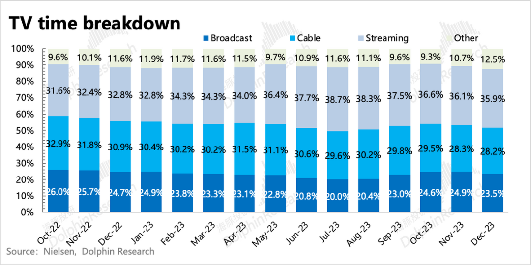 尤其是罢工影响,按照一般的制作周期,至少还会持续个半年。而同行降本增效的压力,也可能需要等到下半年高息环境明显减弱后才能看到战略的转变。从Nielsen的数据来看,奈飞5月开始共享限制,平台的收视份额上了新台阶后,就一直保持相对稳定。9月、10月连续下滑到7.2%,可能与多个体育赛事开播有关(奈飞甚至流媒体平台在体育内容上都不太占优势)。但从11月开始,奈飞就又回到了旺季周期上,收视份额连续攀升至7.7%。而老对手YouTube反而从9%下滑了0.5pct。