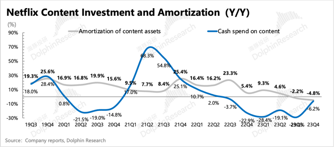 四季度的股东信上,管理层也花了不少篇幅讨论竞争。不过管理层对传统内容公司的竞争力并不担心,因为这些内容公司还陷在传统渠道衰落的坑里。但对科技公司的流媒体平台、短视频平台以及含视频的社交平台都保持高度关注。四、罢工扰动不改内容投入新周期海豚君在过去几个季度的财报点评中一直提及,奈飞的内容摊销一直在增加,但内容投资的在加速下滑。当内容资产规模在上季度开始环比转负后,就说明奈飞的内容投资可能要触底反弹。